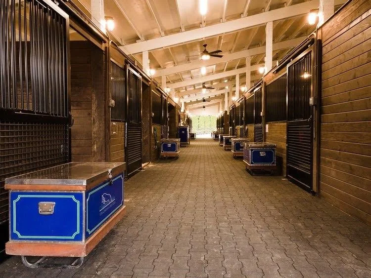 Horses enjoy full-care boarding with 12' x 12' stalls with rubber mats and automatic waterers, select stalls with attached paddocks, stall and ceiling fans, heated grooming bays, individual year-round turnout paddocks, seasonal grass pastures, and quality Timothy or Alfalfa hay.